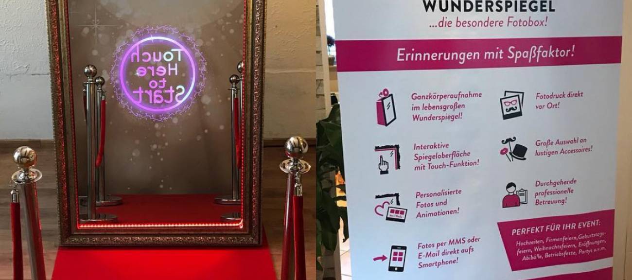 Ab sofort im ganzen Rhein-Main-Gebiet! Ob Mainz, Wiesbaden, Frankfurt, Hanau, Offenbach, Darmstadt, Mannheim, Heidelberg, Limburg oder Koblenz, das Team von Wunderspiegel kommt zu euch. Der Wunderspiegel - ...die besondere "Fotobox" für eure Hochzeit