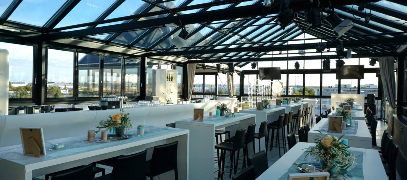 Auf 12m Höhe befindet sich das Panorama 250 der Pyramide Mainz – eine vollverglaste Dachterrasse mit Blick in den Taunus. Bei Sonnenschein oder Regen, durch das über 80m² zu öffnende Cabriodach ist die Location ideal bei jeder Wetterlage.