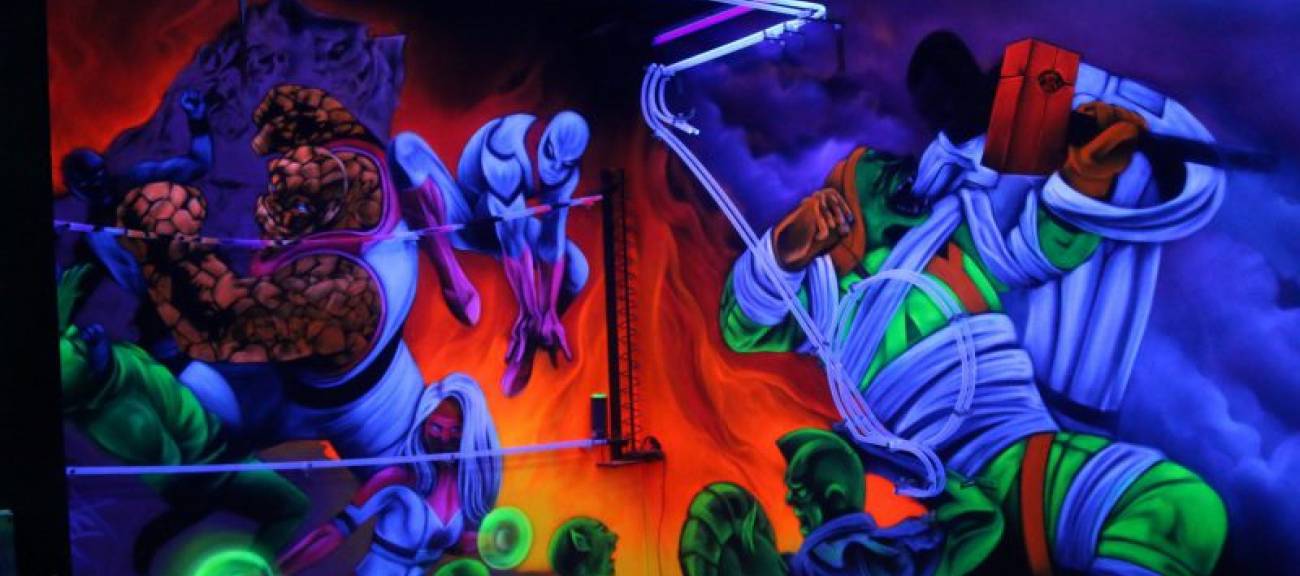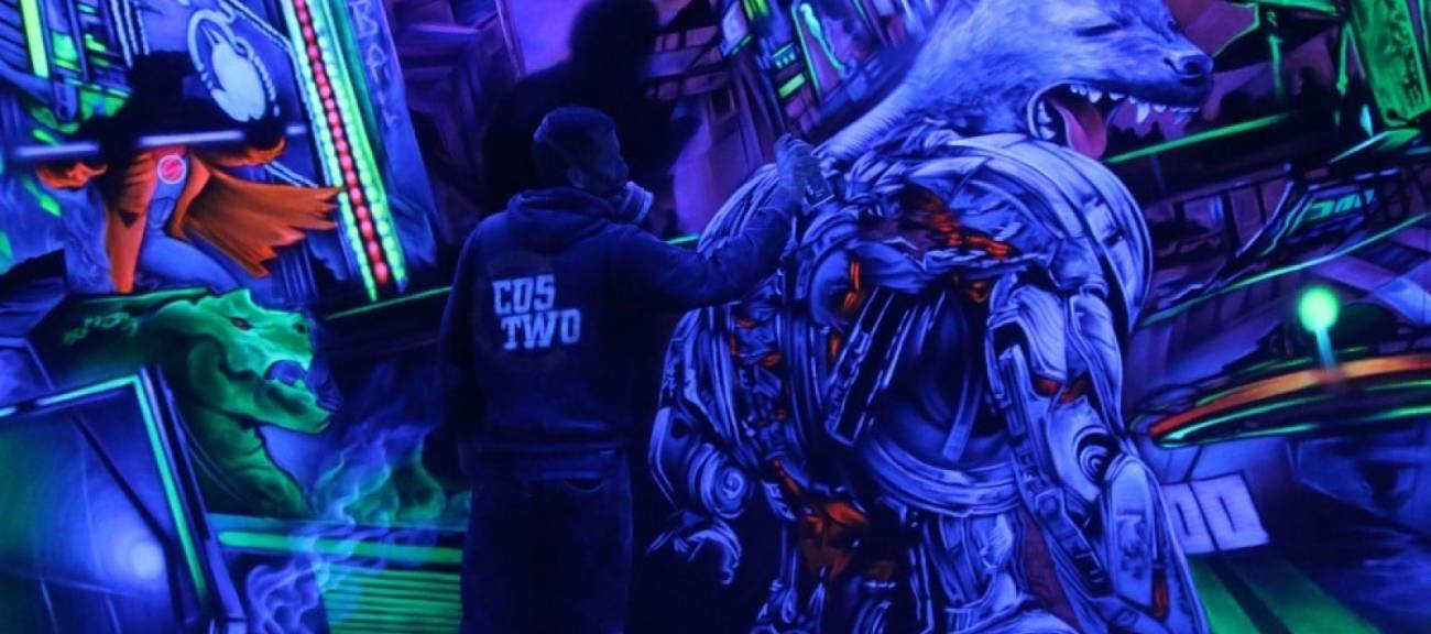 Graffiti-Art meets Schwarzlicht: Spezielle UV-Neon-Farben bringen die Graffiti schrill zum Leuchten und euch zum Staunen. Profi-Tipp: Blitz aus beim Fotos schießen!