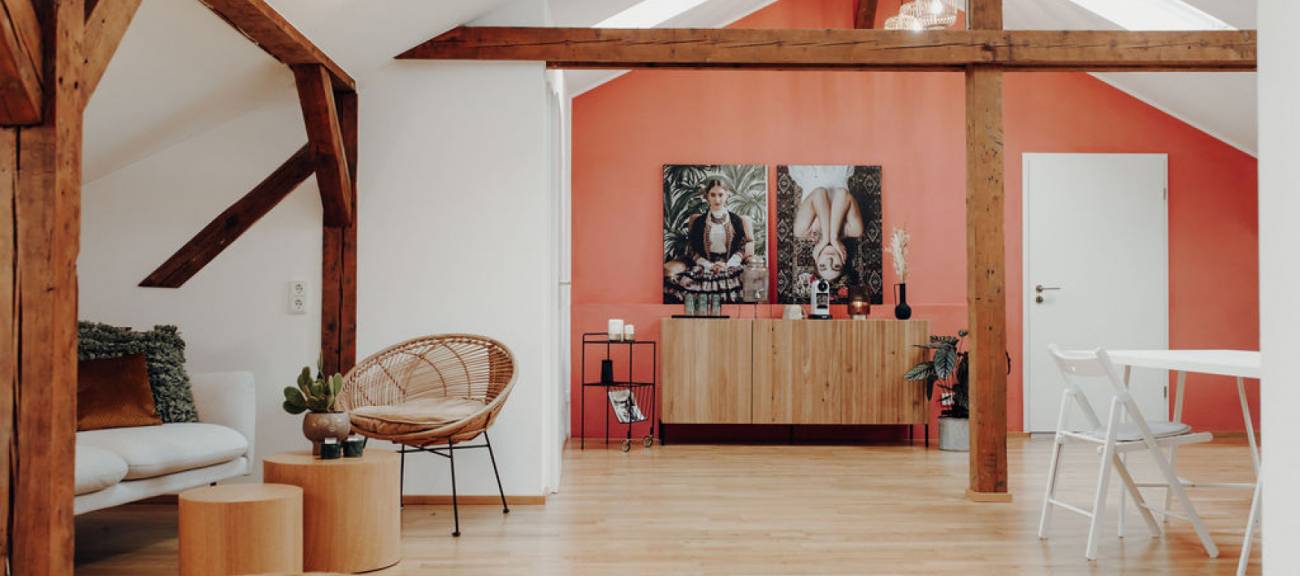 Ein Raum – viele Möglichkeiten. Das 80qm große Kreativstudio liegt im Dachgeschoss einer alten Kaserne in Mainz Gonsenheim und kann für unterschiedlichste Anlässe gebucht werden.