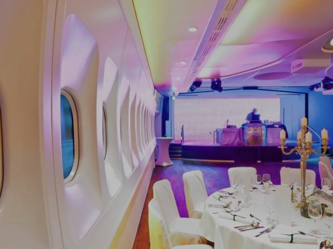 Das Raumkonzept im Flugzeugdesign schafft eine inspirierende Atmosphäre für produktive Besprechungen und kreative Ideenfindung. Originale Flugzeugteile wie Sitze, Fensterreihen und Turbinen schaffen eine Kulisse, die eure Tagung zu einem Erlebnis macht. Darüber hinaus begeistern die Bose Soundanlage, über 50 LED-Monitore, ein aufwändiges Beleuchtungskonzept und unzählige weitere individualisierbare Details, wie die neue 15m² große LED Wand auf der Bühne.
